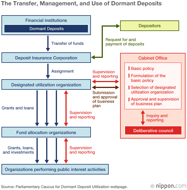First, funds in dormant bank accounts will be transferred to the Deposit Insurance Corporation. A private foundation will be established as the designated utilization organization to which funds will be assigned. The basic plan for the management policies of the designated utilization organization will be specified by the prime minister. The designated utilization organization will select from a number of applying regional and community foundations across Japan with positive track records to serve as fund allocation organizations, which will provide grants, loans, and investments for projects being undertaken by local civic groups.
