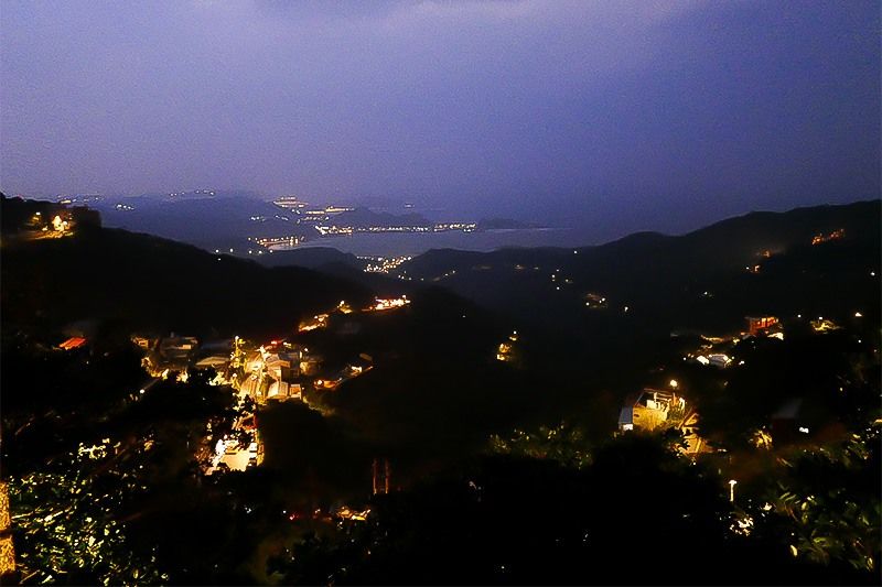 大型の宿泊施設もない。九份は夕暮れから夜にかけての景色に醍醐味(だいごみ)がある。夕日であかね色に染まる山々と、黄金色に輝き始める海が重なり合う様は、一幅の上質な絵画を眺めているような穏やかな気持ちになる。漆黒の暗闇に包まれる街の赤ちょうちんに灯がともり、かつて金鉱の街として栄えていたころのにぎやかな歌声や、笑い声が聞こえてきそうなムードに覆われる。見下ろす漁港には、気持ち良さそうに、漁船のあかりがゆったりとプカプカ動いている。明け方の九份は、朝靄(あさもや)とともに、幻想的で静寂に包まれた別世界が現れる。