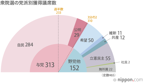 10月22 日に実施された第48 回衆院選(定数465)は、自民党が追加公認3人を含め284議席を獲得した。連立を組む公明党の29議席と合わせて与党で313議席を占め、与党の大勝で終わった。憲法改正の発議に必要な衆院定数の3分の2を超えた上、野党のうち日本維新の会や希望の党も改憲に前向きで、安倍晋三首相の悲願とする憲法改正への数的条件は整った。しかし、焦点となる憲法9条の見直しは与党内でも十分な意見の一致を見いだすのは困難で、実現は容易ではない。首相は国民からの期待が強い経済政策を推し進めつつ、憲法改正については野党も巻き込んで幅広い合意を形成していく構えだ。