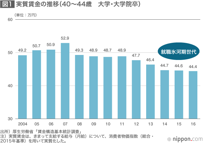 2005年から世界金融不況が始まる直前の07年までは、給与平均は50万円を超えていた。現在の為替レートからすると、5000ドルをわずかに下回る程度で、かなりの高額だ。当時の40代前半が大学を卒業して就職したのは、まだ日本がバブル経済を謳歌(おうか)していた時代だった。彼らバブル世代は、就職活動にさほど苦労をすることもなく、採用後も長期雇用や年功賃金といった伝統的な日本的雇用システムに守られてきた。