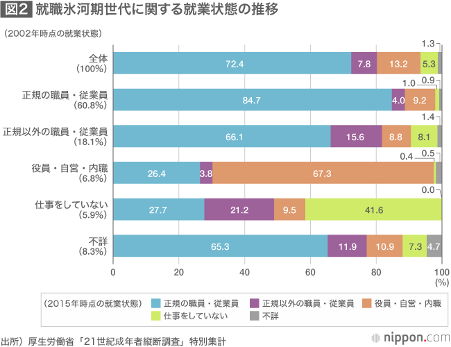 さらに深刻なのは、なんといっても仕事をしていない氷河期世代だ。図2でも新卒で就職ができずに2002年に仕事をしていなかった氷河期世代は6%存在していた。そのうち2015年にも仕事をしていない割合は40%を超える。働いたとしても非正社員や自営業の場合が多く、正社員になれたのは30%にも満たない。2000年代に就職がうまくいかず、働くことに自信を失い、就職活動を断念した若者を、日本では「ニート(NEET(※1))」と呼ぶようになった。そんなニートだった若者が、今や働くことを諦めた「中高年ニート」になっている。