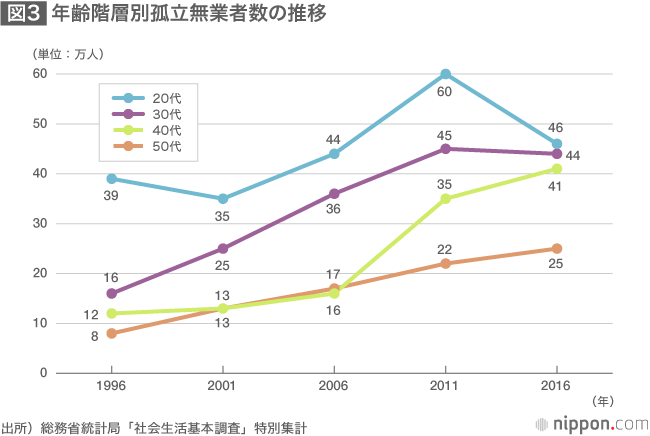 このうちSNEPの年代別の推移を示したのが、図3だ。SNEPは20代が最も多いが、人手不足で若者の就職が改善したこともあって、2011年から2016年に大きく減少した。それに対し、40代のSNEPの増加が止まらない。その中には氷河期世代も多く含まれている。