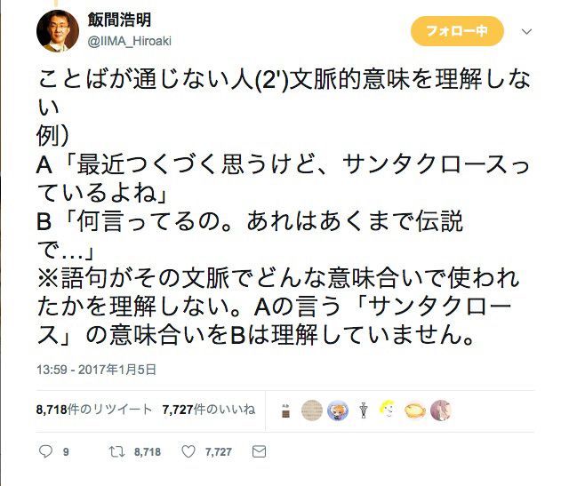ここで起こっている行き違いは、飯間氏による分類「ことばが通じない人(2')文脈的意味を理解しない」の例に当たる。