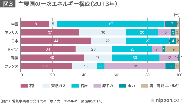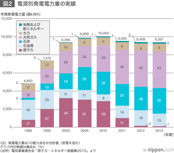 今回打ち出された2030年の電源構成案では、経済性重視とともに温室効果ガス抑制に大きく寄与する原子力の比率を20~22%とし、再生エネも現在より倍増する22~24%に高めた。火力(石炭・天然ガス・石油)は2014年度には発電量全体の88%を占めていたが、56%まで低下するため、燃料費は2030年度時点で4割以上減少すると試算している。
