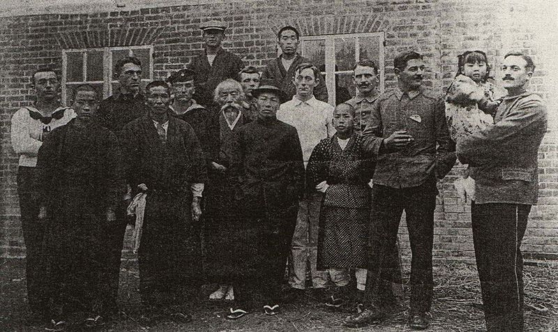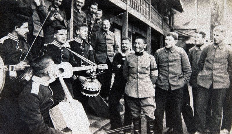 〔写真4〕は、板東収容所近くに捕虜たちと地元の大工30人の共同作業で建てられた富田酪農場(今日は「ドイツ牧舎」と言われる)前で、解放間近の1919年12月頃に撮影された記念写真である。幼女を抱くドイツ兵や、たばこを手にしてそれを見やるドイツ兵の姿には、捕虜の身を思わせるところは微塵(みじん)も感じられない。国際法を遵守した捕虜取り扱いが行われていた証しである、とみることができよう。