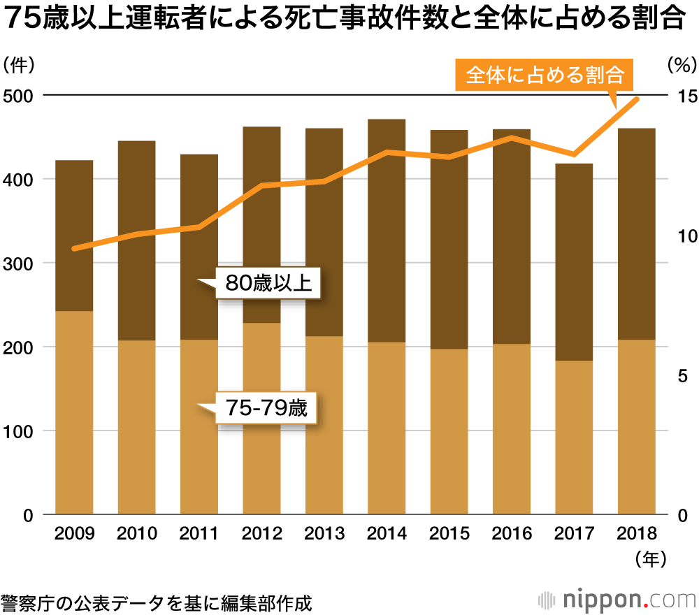 75歳以上運転の死亡事故、18年は460件 : 全体の15%占め過去最高