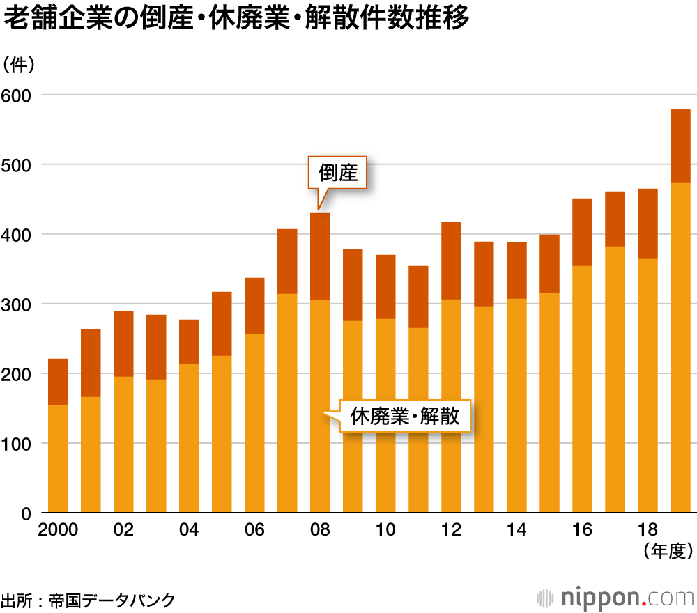 帝国データバンクがまとめた創業100年以上の企業を対象にした「老舗企業倒産・休廃業・解散の動向調査」によると、2019年度は倒産、休廃業、解散合わせて579件(前年度比24.5%増)を記録し、5年連続増となった。件数・増加率ともに過去最多を更新した。